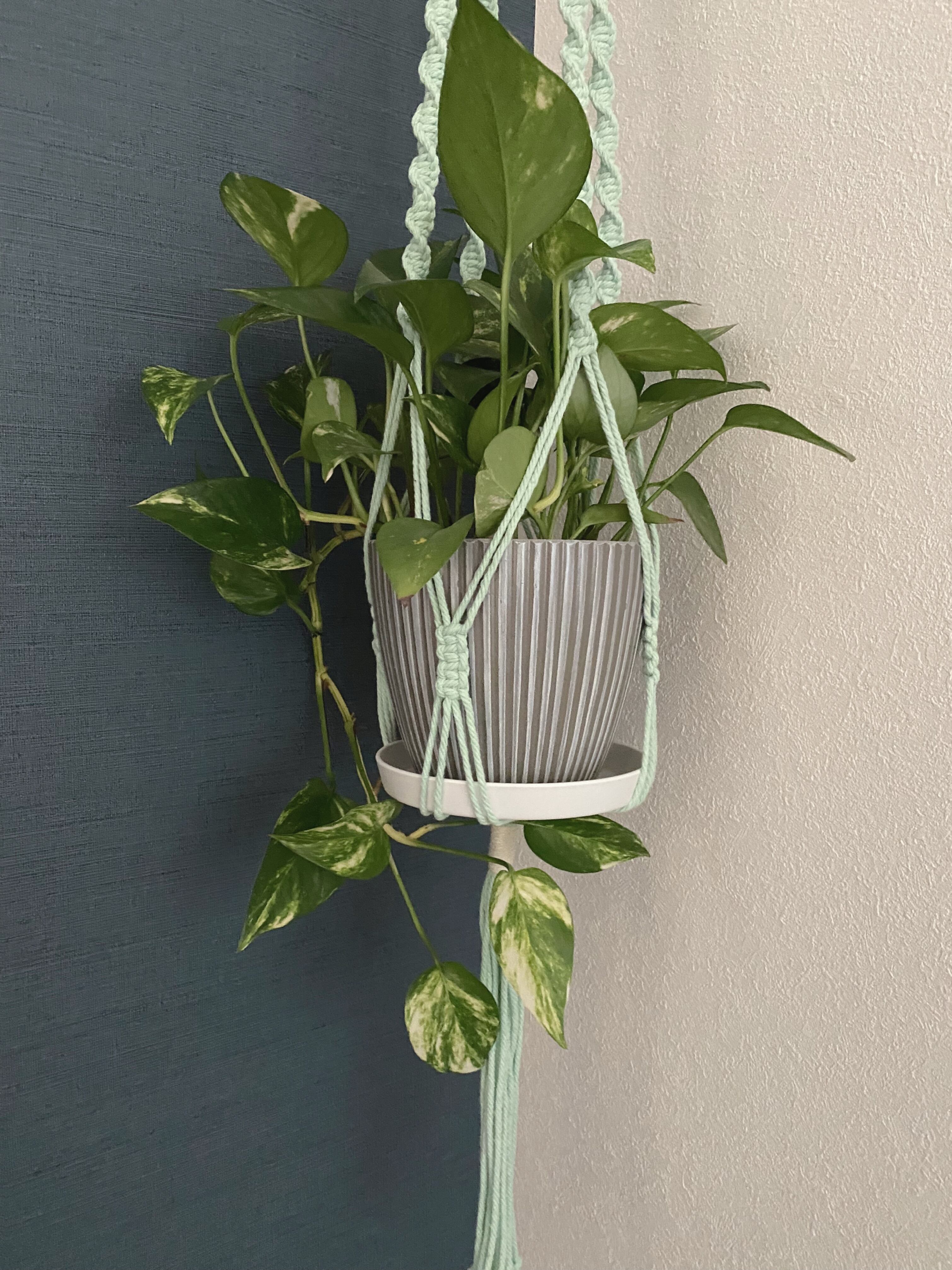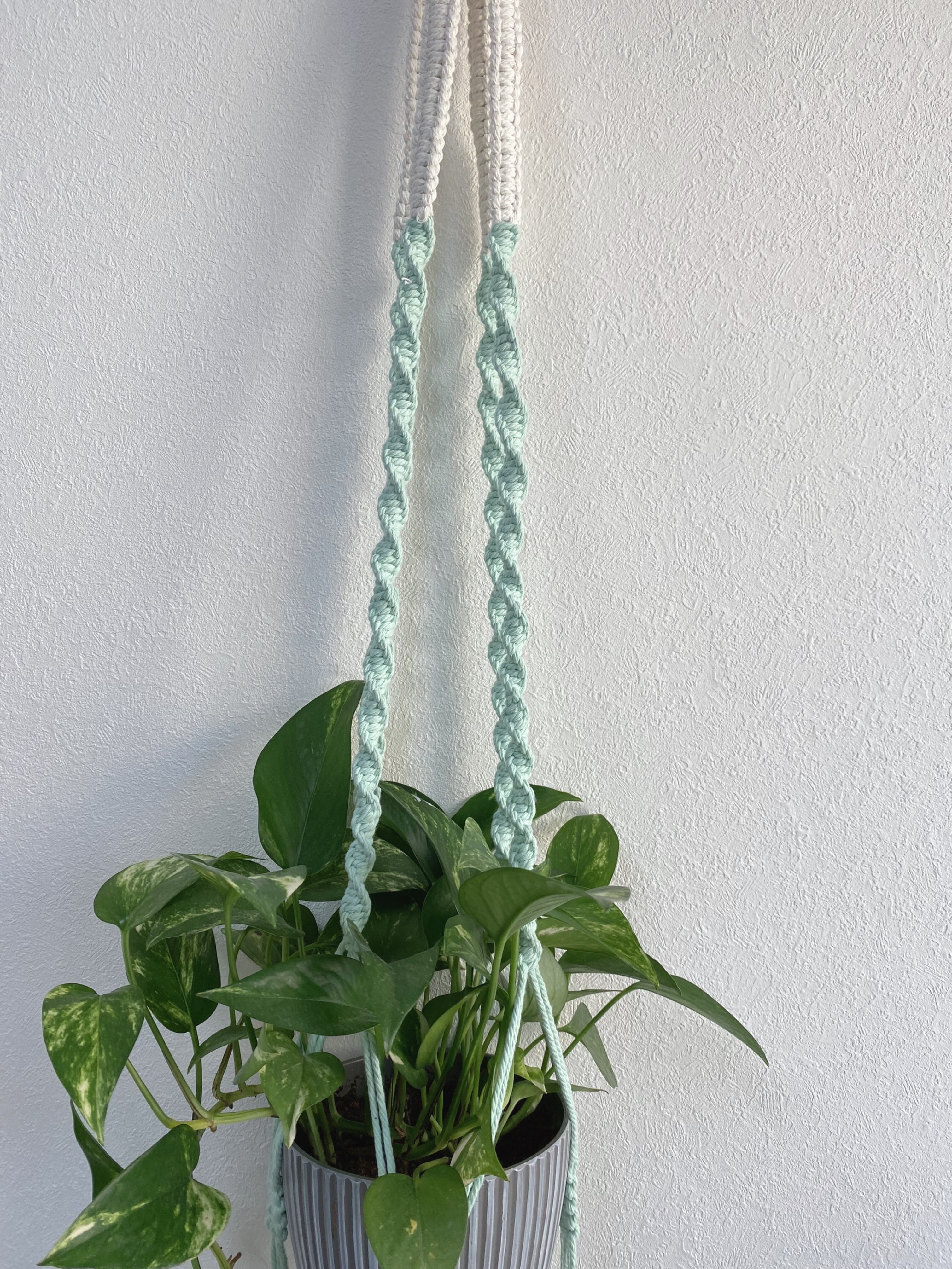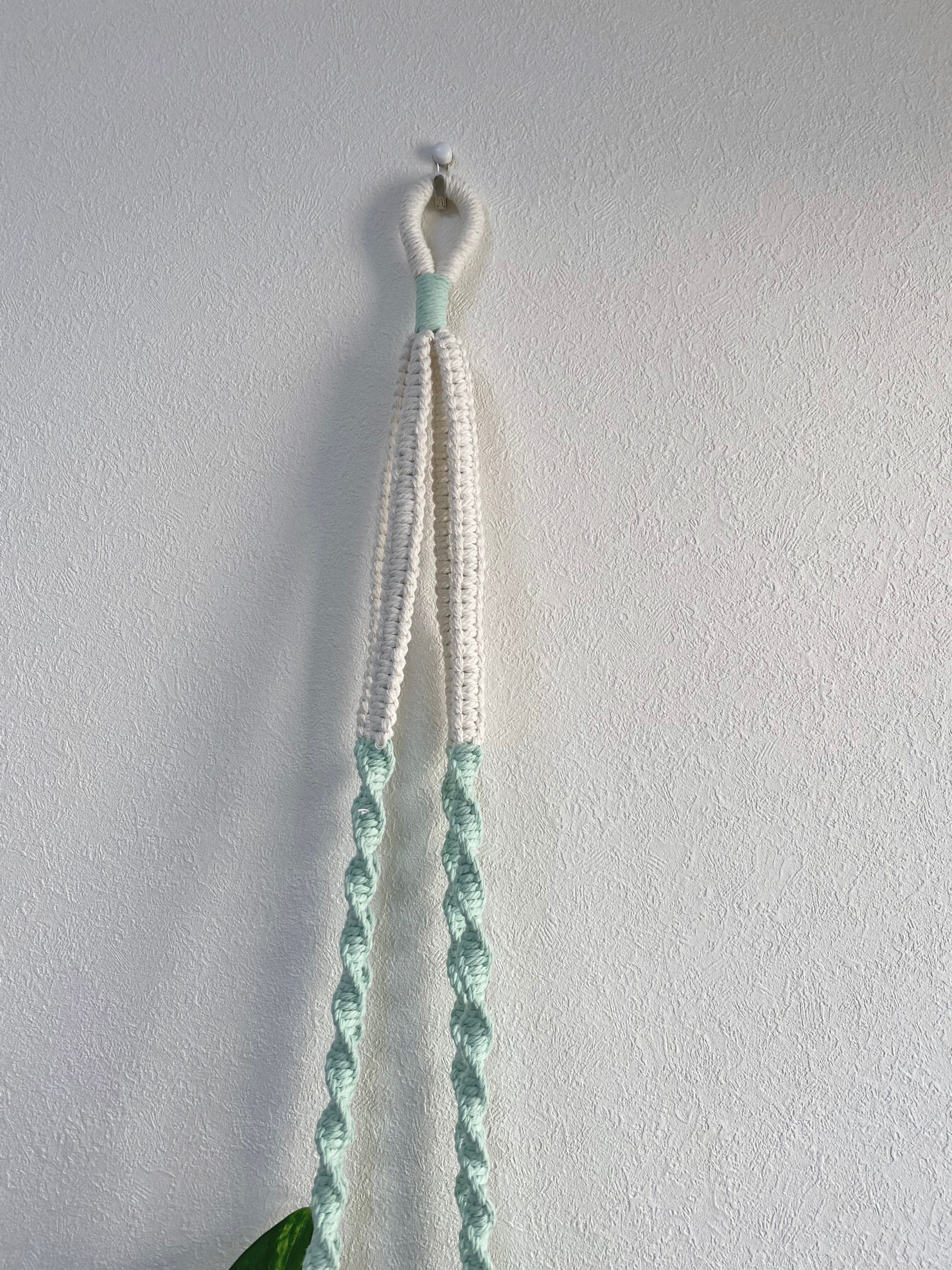 ライトグリーンのマクラメプラントハンガーとなっております。