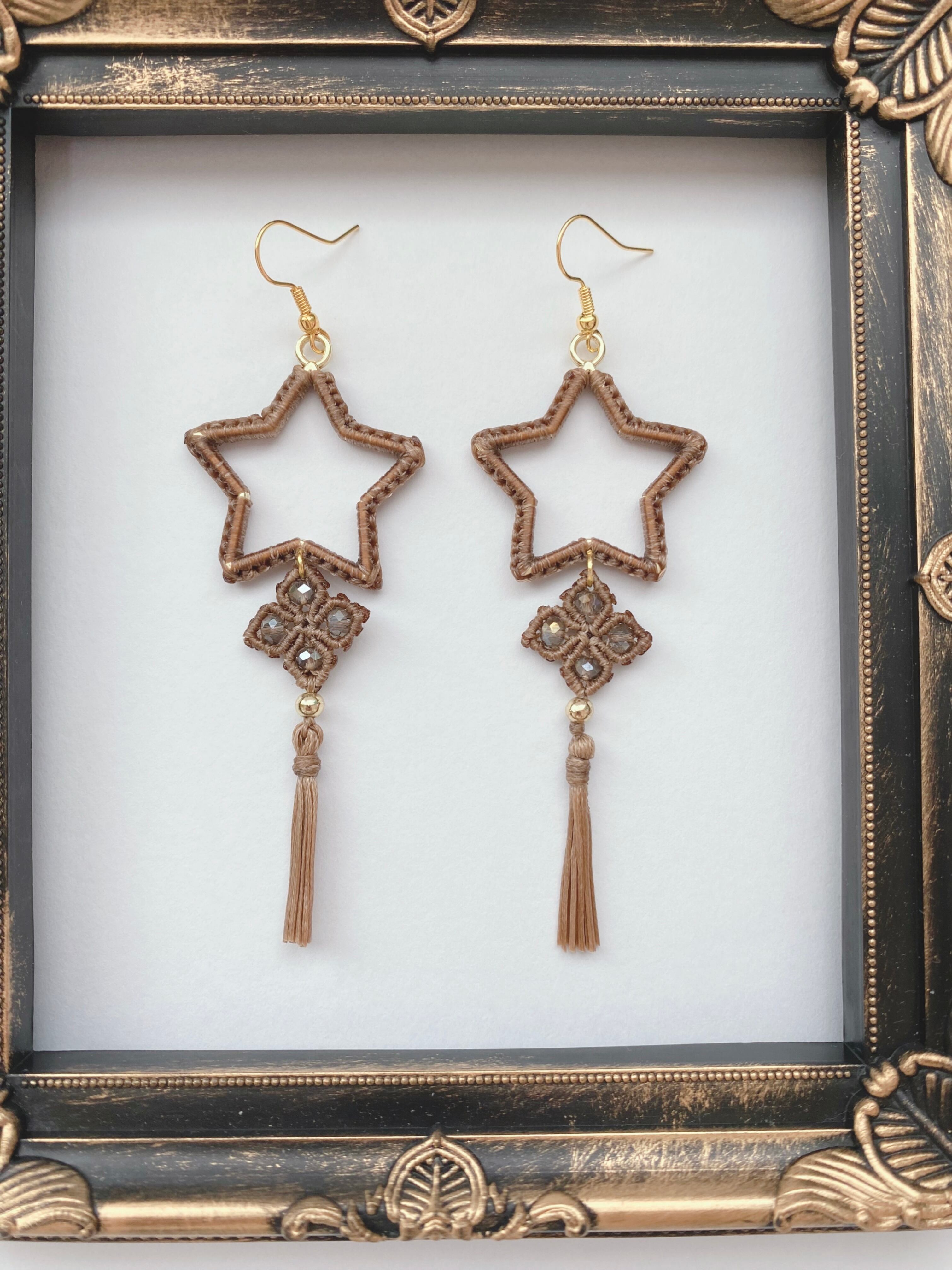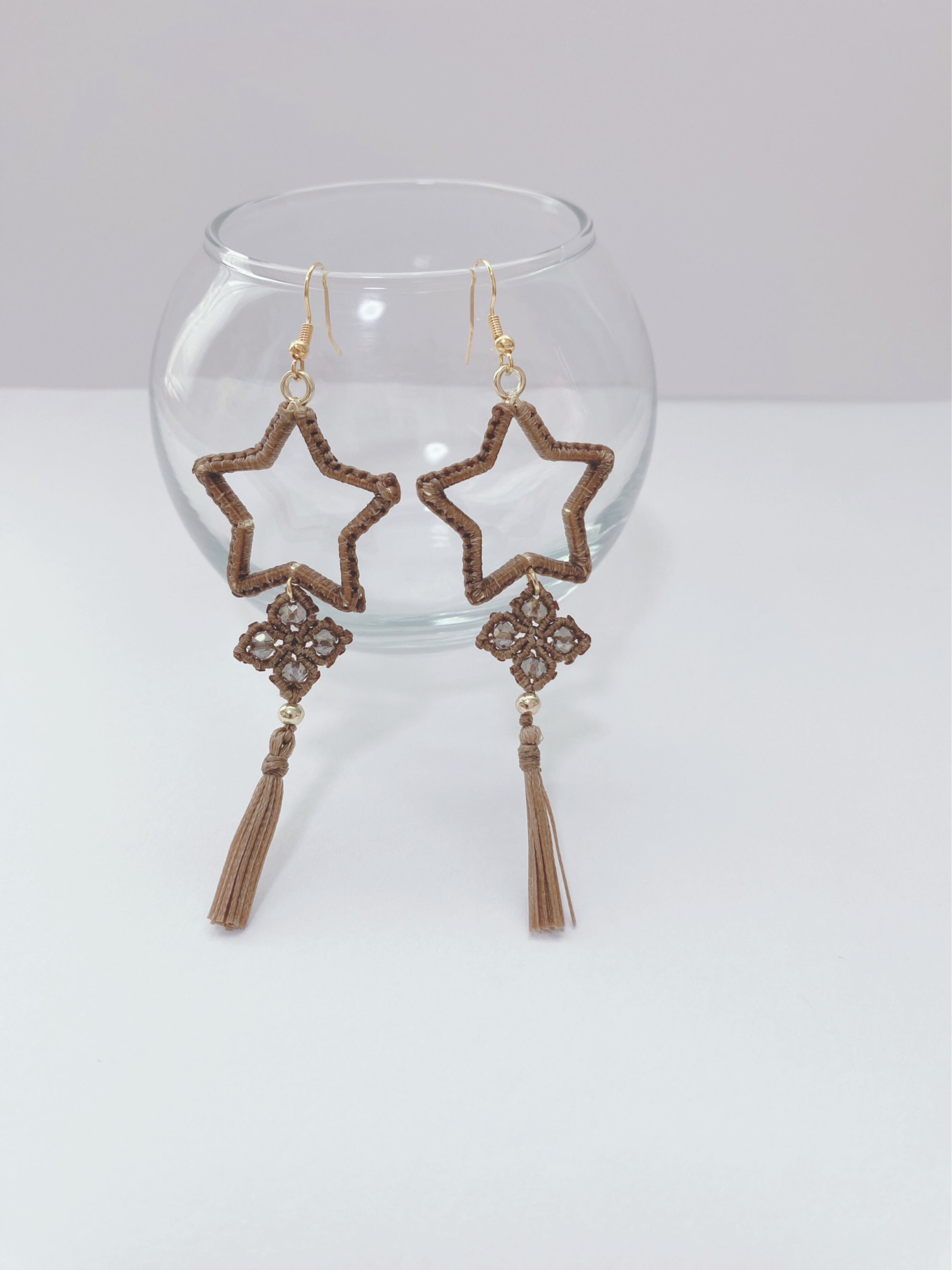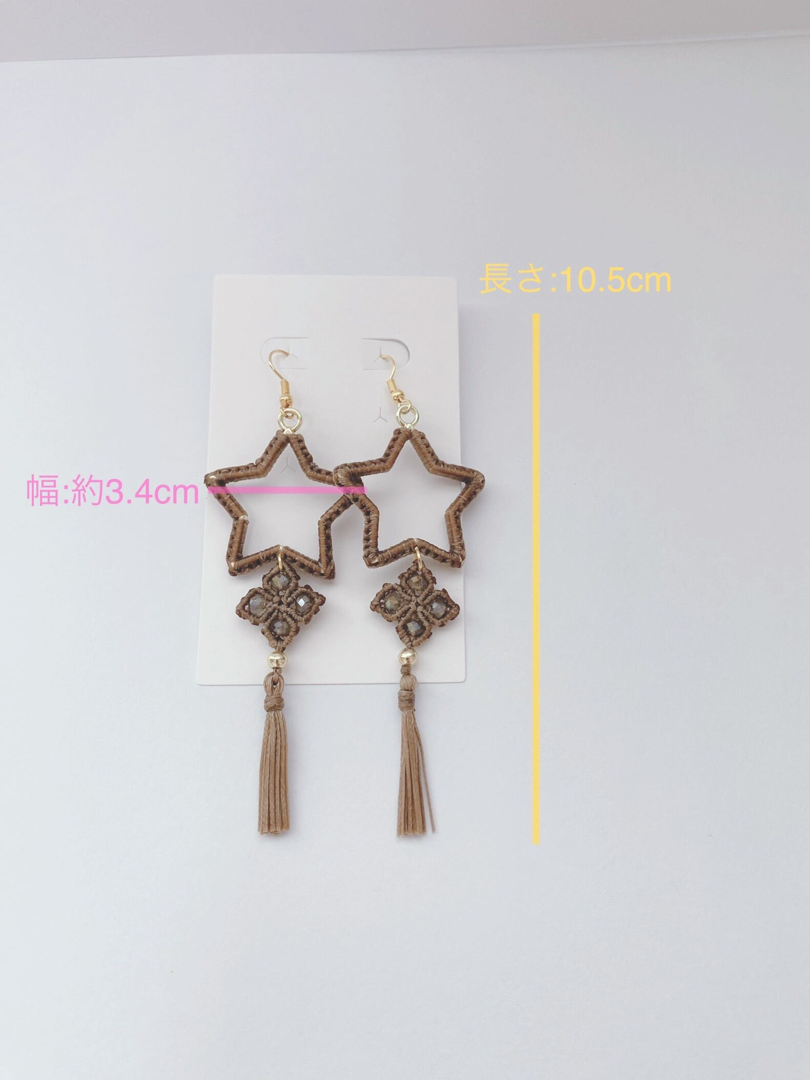 ライトブラウンのマクラメで編まれた星形のピアスです。⭐️✨